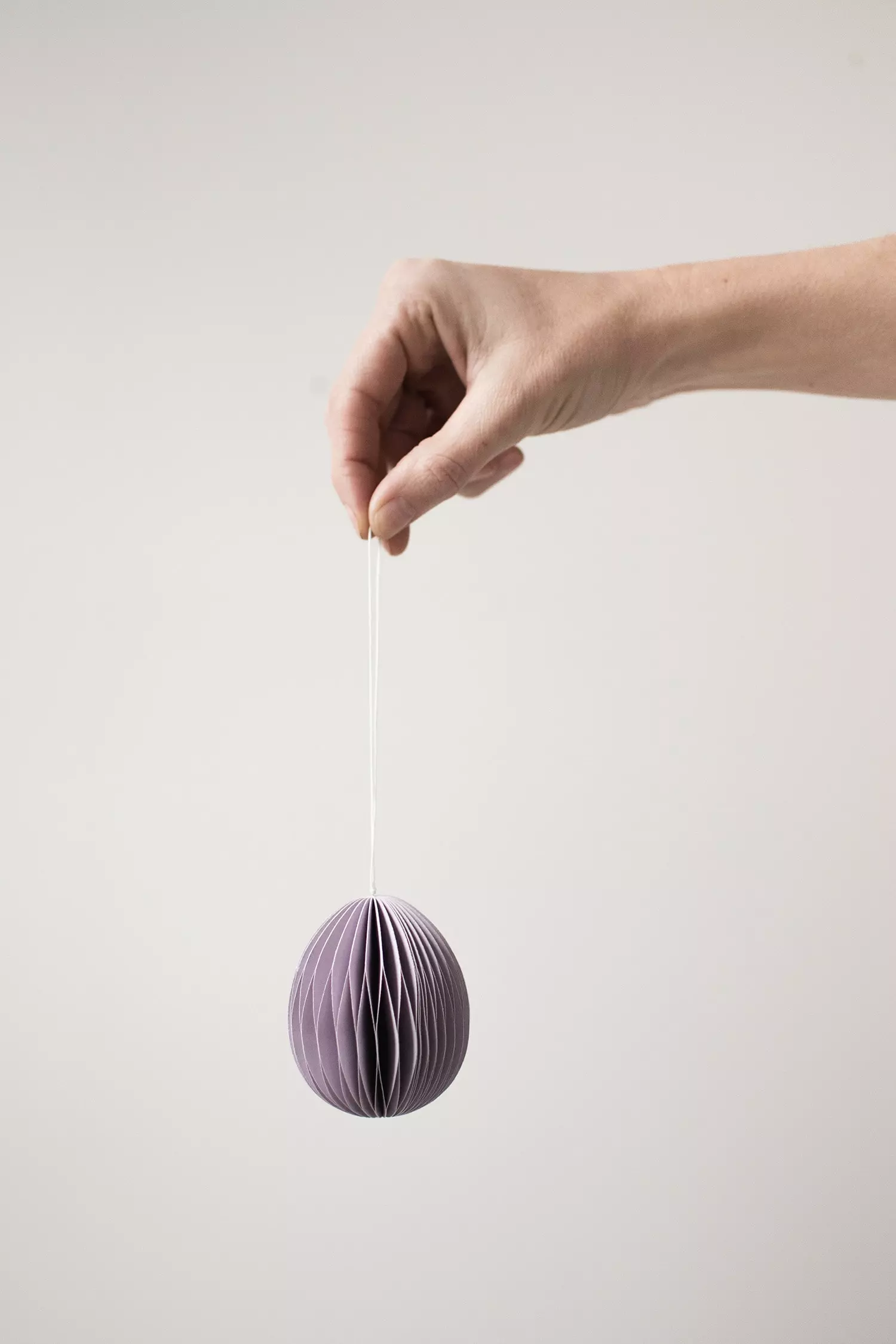 Pääsiäiskoristeessa DBKD-merkin on yksinkertainen, taitettava, munanmuotoinen muotoilu paperista pehmeällä, liilalla värillä jotka sulautuvat harmonisesti ympäristöön.