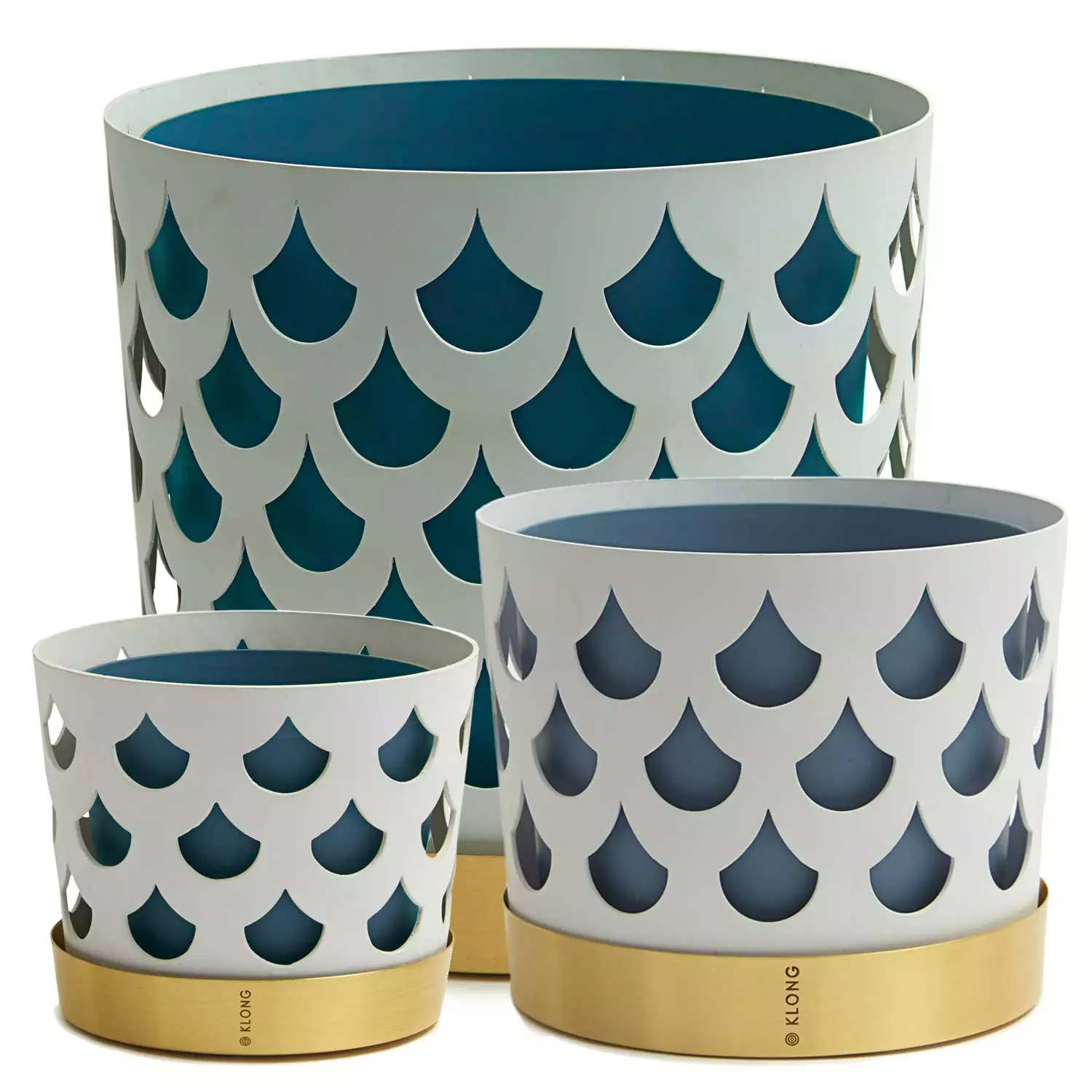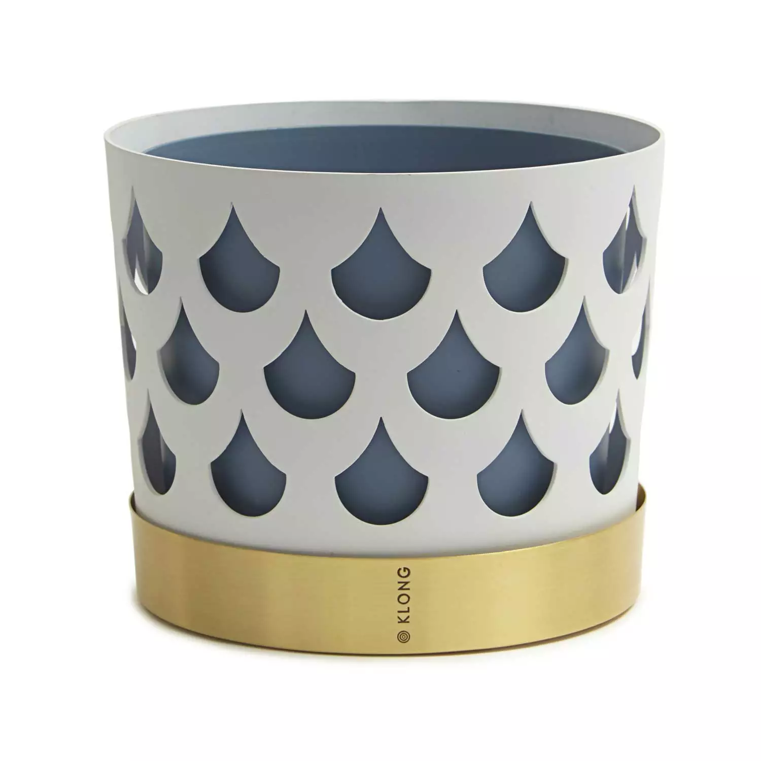 Trio Flower Pot from Klong, designed by Ania Pauser. The pot consists of three parts, an inside pot, an outer pot and a plate. The pots are made of thin lacquered steel and the plate is in brass with Klong’s logo engraved. The pattern of the outer pot is handmade and gives the pots an exciting depth and character without drawing the attention from the flowers in it.